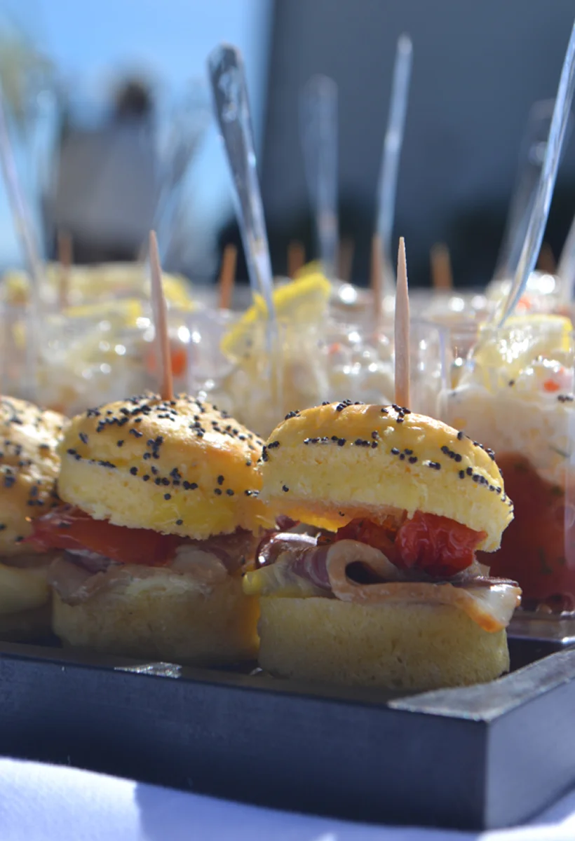 Verrines chaudes de Rouget, Saint-Jacques, mini hamburger magret et tomate confite