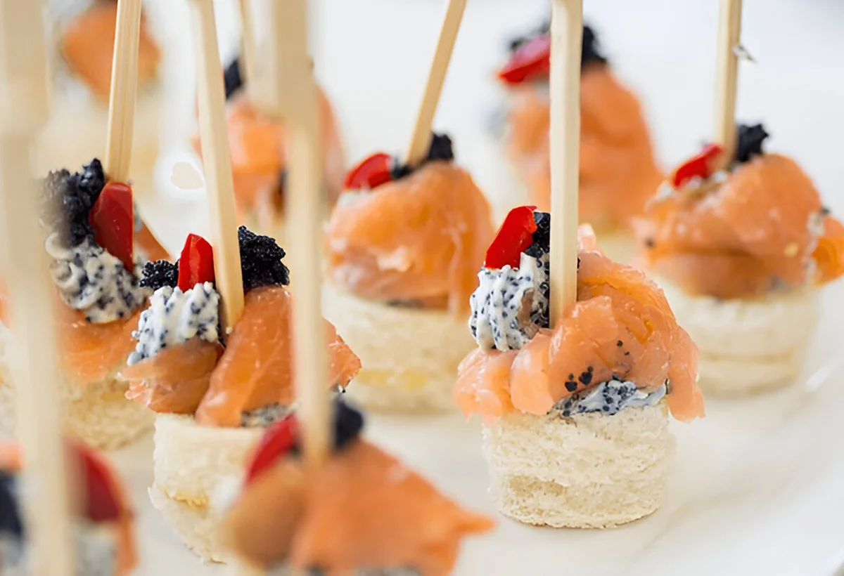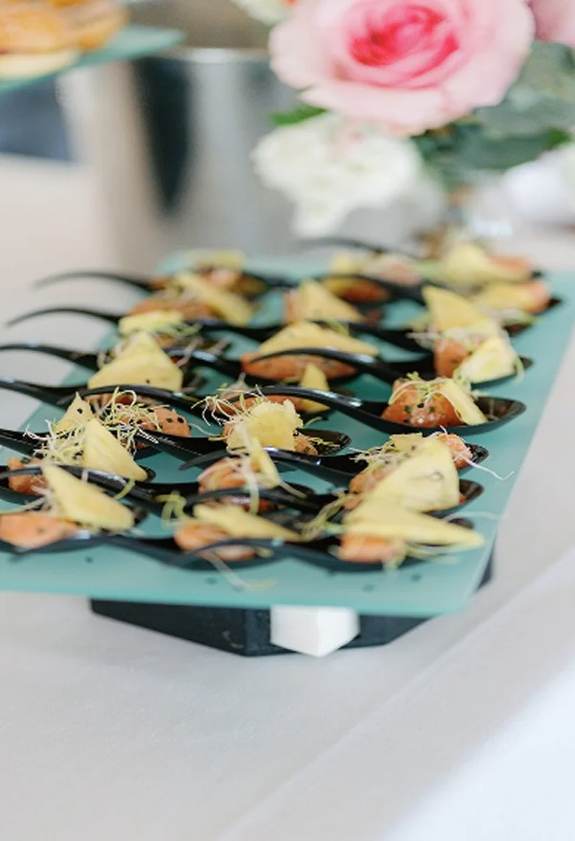 Verrines de légumes, navettes à la crème de foie gras, mini frivolité de saumon fumé